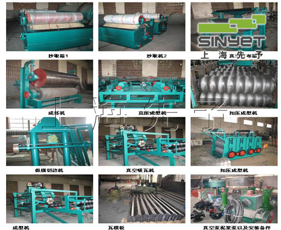 工藝一、抄取機。作用:把原漿中的水份分離并同時把漿料送到打布器脫水,然后成坯; 二、打布器。作用:用于漿料再次脫去多余水份,同時把脫料后毛布表面的雜質清洗掉; 三、成坯機。作用:把從成坯機上脫下來的毛坯瓦送至直壓機; 四、接坯機。作用:把從成坯機上脫下來的毛坯瓦送至直壓機; 五、直壓機。作用:把石棉瓦毛坯壓制成型; 六、扣壓機。作用:把壓制成型后的石棉瓦加壓成型; 七、切邊機。作用:要據(jù)客戶需求把成型后的瓦毛邊切去; 八、吸瓦機。作用:把制作后的瓦堆起來; 九、攪拌機。作用:把按比例配好的原料加水后充分攪拌; 十、風機。作用:和吸瓦機配合,給吸瓦機提供氣流; 十一、真空機。作用:和打布 器配合吸干毛布中的水份; 十二、氣水分離。作用:分離水的容器; 十三、輸送機。作用:運輸石棉瓦用長度可制定。